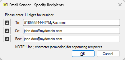 If the Prompt the user for Email to Fax option is selected, users can specify the email subject and email body fields in the configuration dialog box. Every time one sends an email with the Print2Email, a window appears with the option to specify recipients.