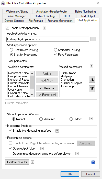 By default the printer driver messaging interface is enabled. To disable the printer driver Messaging Interface, navigate to the “Start Application” Tab of the printer driver and uncheck the “Enable Messaging Interface”. The Messaging Interface can be configured through the INI file during installation, see the Configure the printer setting for every users through the INI file section of the manual.