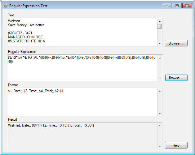 Paste the extracted text into the Text area, the content from regexp.txt into the Regular Expression area and the content from regexpformat.txt into the Format area in Regular Expression Test sample. The Result area will automatically refresh where the user can see the result of the regular expression script.