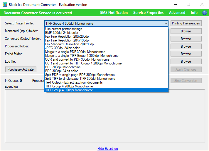 The Document Converter Server can be configured by selecting one of the predefined profiles from the Select Printer Profile list: