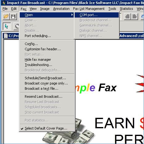 1. In the Impact Fax Broadcast, go to Fax > Open and select COM port option.