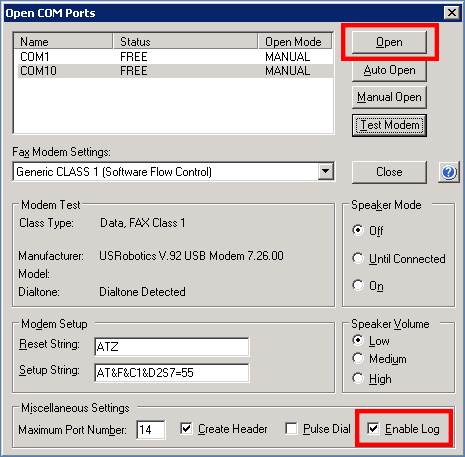 2. Select the opened port, and make sure that the Enable Log checkbox is checked. When finished, click on the Open button to open the port.