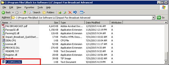4. The log file will be generated into the Impact Fax Broadcast installation folder with the following naming convention: F_PORTNUMBER.LOG.