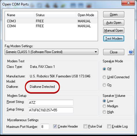 If the phone line is connected to the Modem a Dialtone Detected message will be displayed.