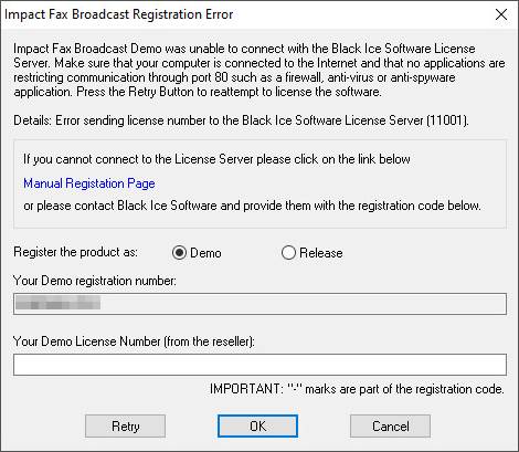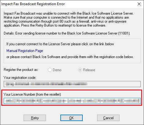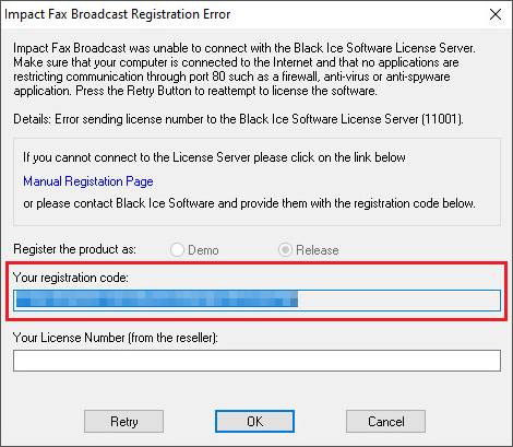 Impact Fax Broadcast requires an active internet connection to register with the Black Ice Software License Server. If your server does not have an active Internet connection or Port 80 is being blocked* by your firewall, then you will see the error message below when launching the Impact Fax Broadcast (registration requires administrator privileges):