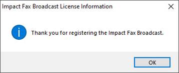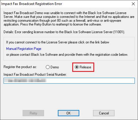 Please select the Release option, enter the serial number in the Impact Fax Broadcast Product Serial Number field and press OK. The serial number can be found in the body of the email containing the download instructions for the Impact Fax Broadcast.