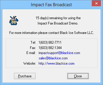 When starting Impact Fax Broadcast, you will then see the dialog below containing the remaining days for your evaluation and contact information for Black Ice Software: