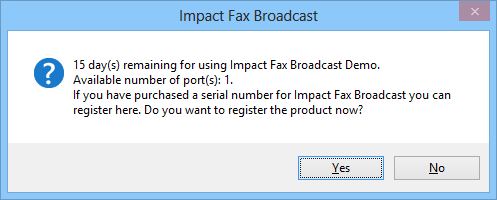If you have already purchased a license for Impact Fax Broadcast and wish to register the release version of the software, click Help → Upgrade License. You will see a screen with your current evaluation information. Click ‘Yes’ to upgrade your demo to the release version: