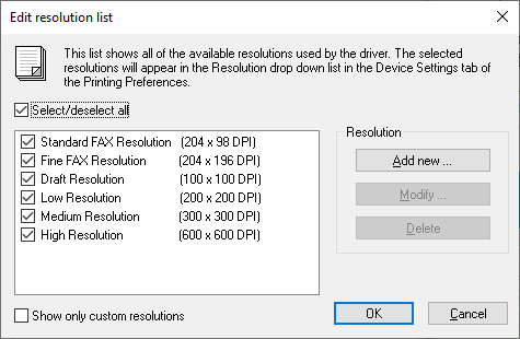 The Edit graphic resolution list window displays the available printing resolutions. The selected resolutions are available for users in the Resolution drop-down list on the Device Settings tab. To hide an item from the Resolution drop-down list, uncheck the checkbox next to the appropriate resolution.