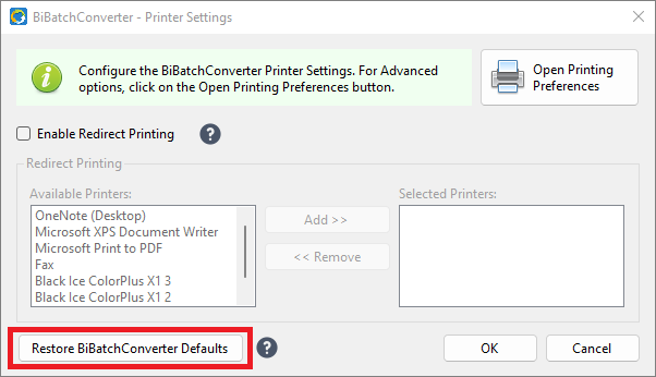 Open the BiBatchConverter application, click on the Printer Settings tab, and click on the "Restore BiBatchConverter Defaults" button.