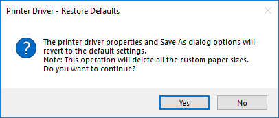 The Restore defaults button restores all the default printer settings from the printer configuration .INI file. The Save As dialog options revert to the same default settings as well. This operation deletes all the custom paper sizes. Once pressed, the following warning message is displayed: