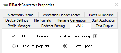 Users can OCR documents, pages or selected areas of any printable document/image on the BiBatchConverter’s OCR Tab (Start > Control Panel > Printers and Devices > right click on the Black Ice BiBatchConverter > Printing Preferences > OCR tab).