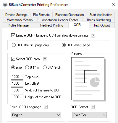 OCR every page – If this option is selected, the BiBatchConverter will OCR every page of the printed document. If the Select OCR area option is also enabled, the BiBatchConverter will OCR the specified area on every page of the printed document.