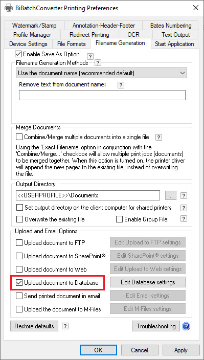 One can enable the Upload document to Database feature in BiBatchConverter > Printing Preferences > Filename Generation Tab > Upload document to Database.
