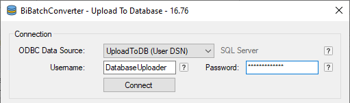 If Silent Upload is unchecked (disabled), the Upload to Database feature displays the following window; one can specify the username and password for the configured ODBC Data Source.