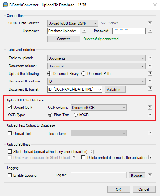 · Upload OCR: Enables uploading OCR (Optical Character Recognition) text to the database. When this option is enabled, and the Printer Driver generates OCR text during the printing, the Upload to Database feature will upload the text to the selected OCR column.
