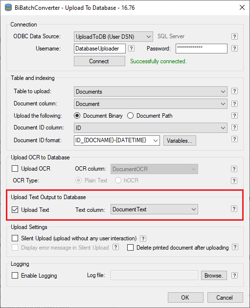 ODBC Data Source: One can select the destination ODBC data source to upload the documents to.