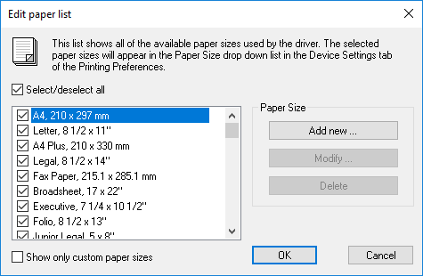 · Show only custom paper sizes - If selected, standard paper sizes are not shown in the list.