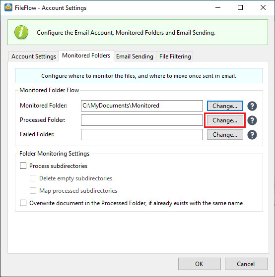To upload documents to a OneDrive folder, please change the output directory on the Account Settings tab by clicking on the Change button next to the Processed Folder field. Please make sure that the OneDrive application is downloaded to the computer.