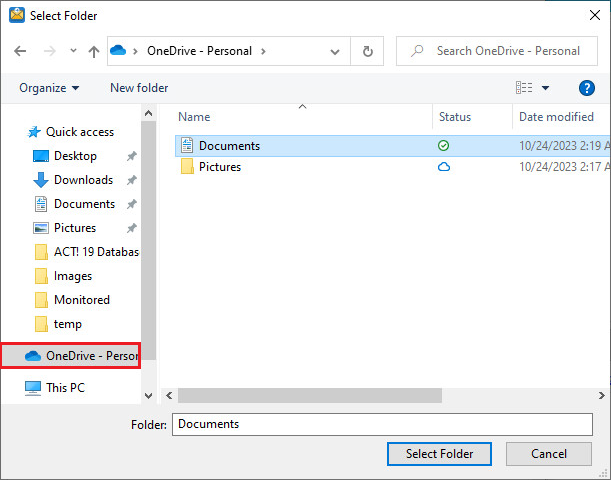 Click Select Folder, and the output directory is successfully created and configured. If the user prints documents to the FileFlow, it saves the printed documents to the selected OneDrive folder.