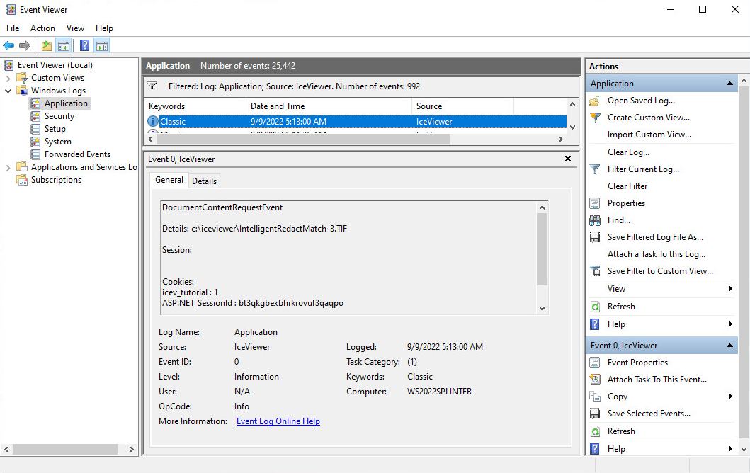 The Event Viewer entry will be generated into the Windows Logs / Application node and will contain the SESSION and COOKIE information to let Administrators identify the session or user who initiated the action.