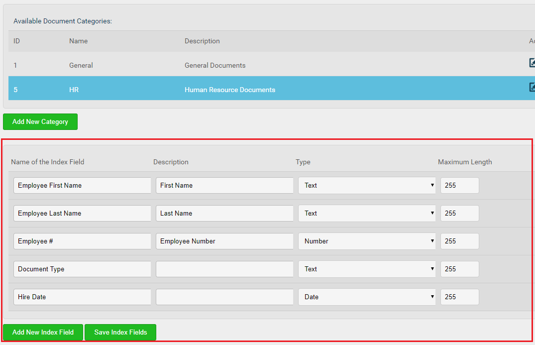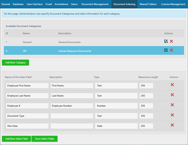 For example, Administrators can create an HR document category, for Human Resources documents. This category can a set of index fields, for example, First Name, Last Name, Employee Number, Hire Date, and so on. When uploading a document, the user can select what category the document should be uploaded into.