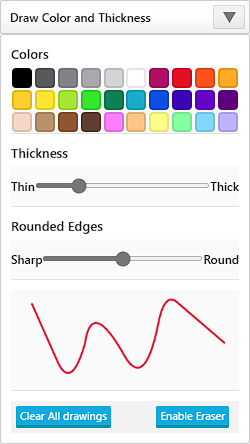 The drawing options appear on the left, where users can select a pencil color and adjust the thickness and sharpness/roundness of the pencil.