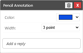 To change the properties of the drawing, please click on the annotation. The Pencil Annotation window appears, where the user can change the color and line width of the drawing.