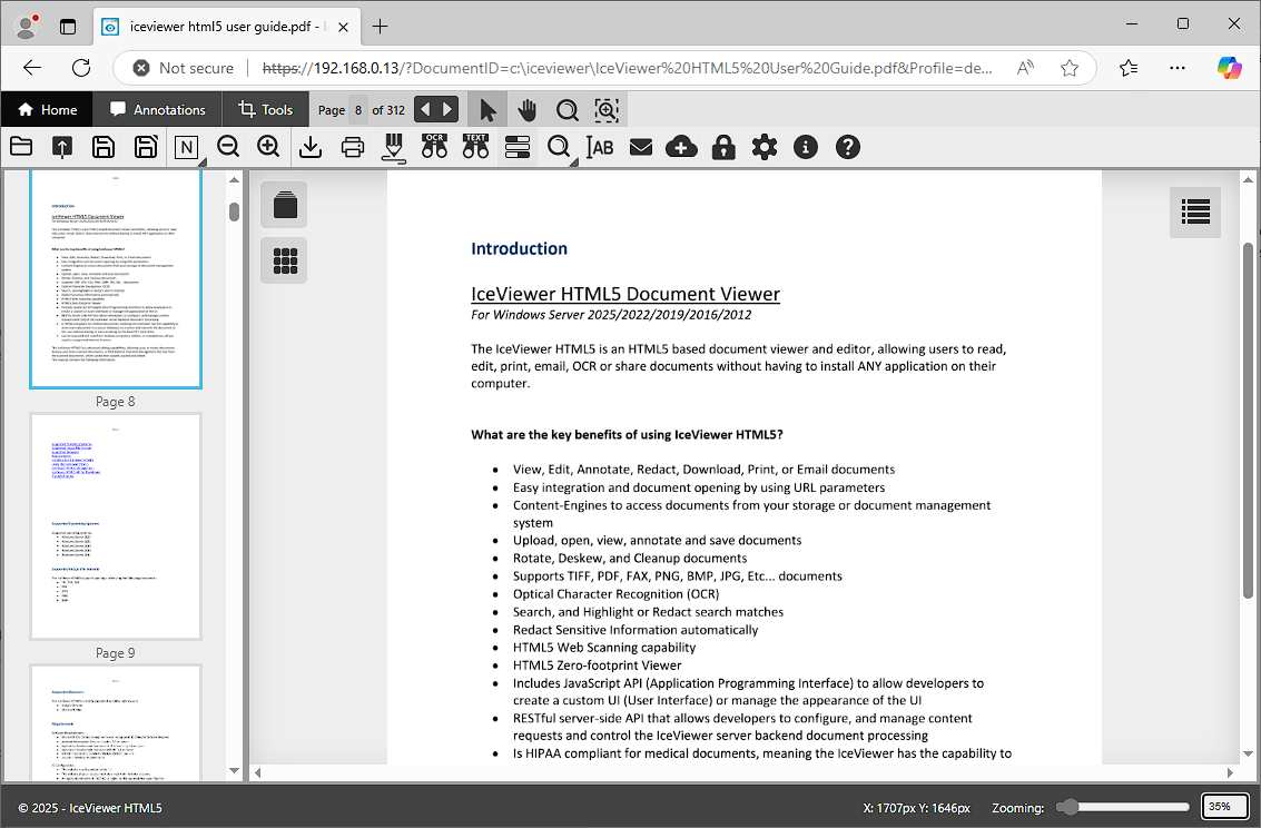 Page thumbnails will be displayed on the left-side. You can navigate between pages by clicking on the page thumbnail, or by pressing Next/Previous arrows on the top.