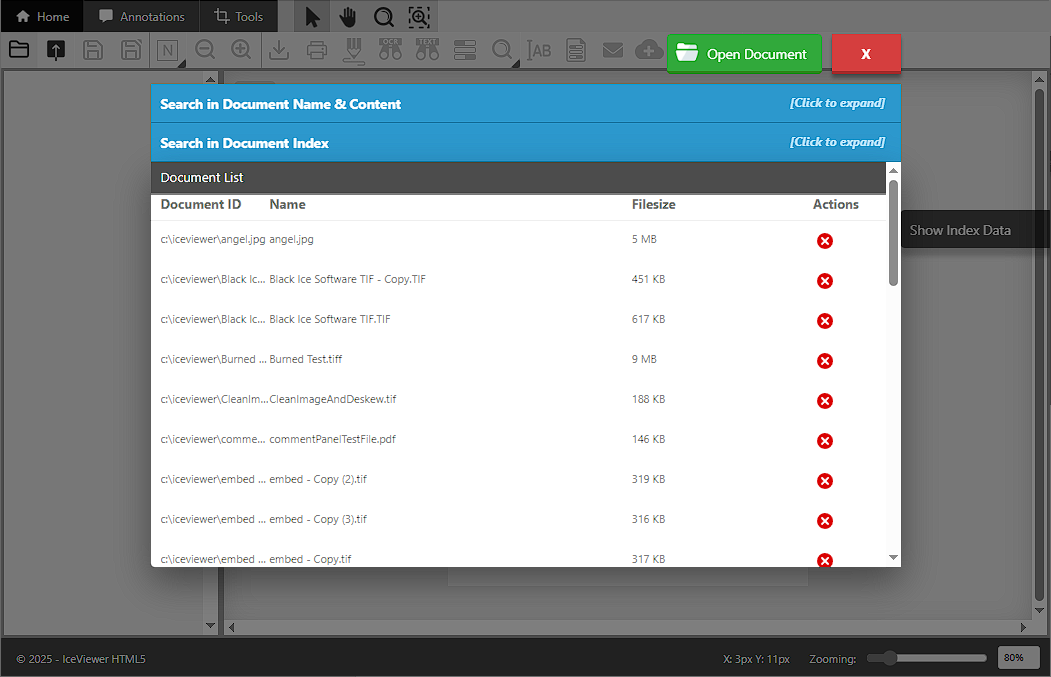 To open a document from the IceViewer HTML5 database, the user can select a document from the Document List. Documents can be filtered by document name and content or by document index.