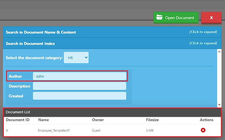 For example, if one would like to search for HR documents, where the employee first name is John, then type John to the Employee First Name field. The documents, where the First Name field contains John will be displayed under document list.