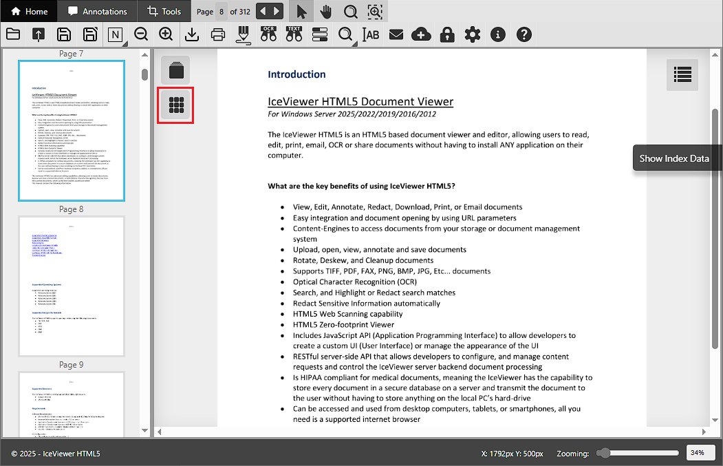 · Mosaic View: the IceViewer HTML5 displays pages as thumbnails.
