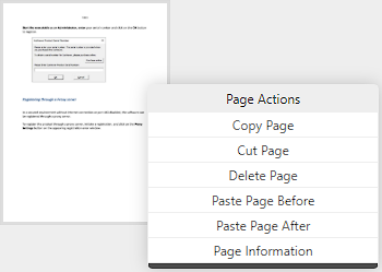 In Thumbnail View Mode, the pages can be rearranged by dragging and dropping a page to a new position. By right-clicking on a thumbnail, and selecting the appropriate operation from the Page Actions context menu one can copy, cut, delete, and paste pages or view the details of the selected page.