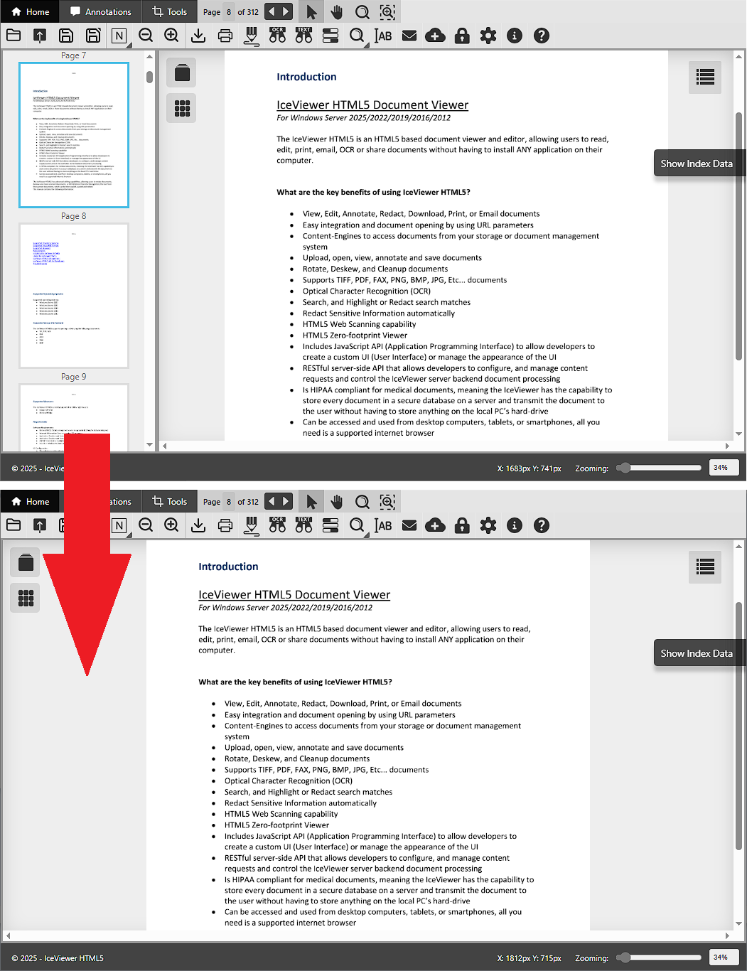 To show or hide thumbnails on the left side of the IceViewer HTML5, please click on the Show/Hide Thumbnails icon on the top left corner of the IceViewer HTML5’s content area.