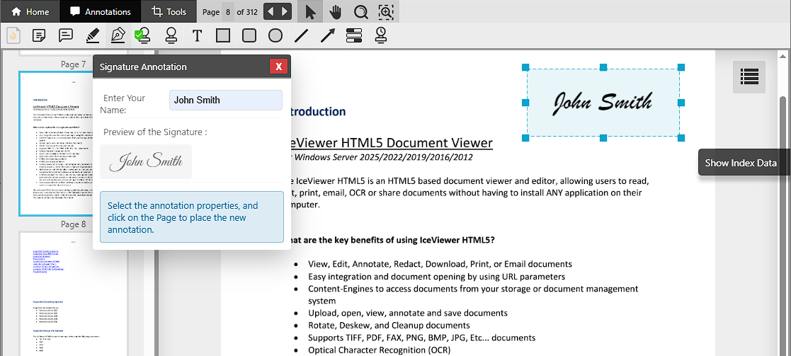 To add a Signature annotation to the document, click on the Signature icon on the top Annotation toolbar, select the style of the Signature, enter your name, and click on the page to place the annotation.