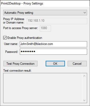 SOCKS Proxy - Select SOCKS proxy from the drop down list to configure the Proxy IP address and port number manually. SOCKS proxy servers establish a TCP connection to licenseserver.blackice.com and forward TCP messages from the Black Ice Print2Desktop during registration and license validation.