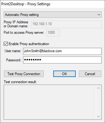 After entering the IP Address/Domain Name, Port, and possible Authentication Credentials to access the Proxy Server desired to use, click the Test Proxy Connection button to test the connection through the Proxy Server towards the Black Ice License Server.