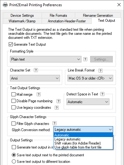 Automatic (default) - This option tries to determine the appropriate method for converting glyph characters to text. This method does not depend on the Character Set setting of the printer driver, it is usable for any language.