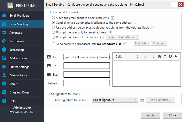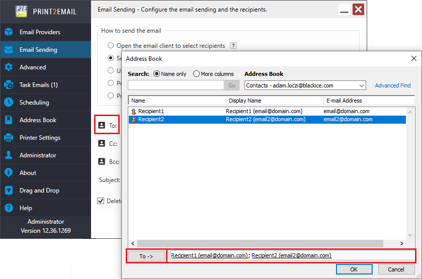 Emailing a converted document to multiple recipients is simple. In Print2Email > Email Sending tab, enter the email addresses separated by a semicolon (;), like this: