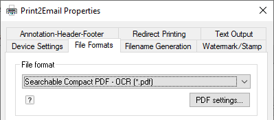 To navigate to the PDF Settings, go to the File Formats tab, select the Searchable Compact PDF file format and click PDF settings…