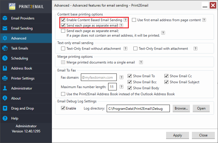 NOTE: Send each page as separate email option can only be used, if the ‘Enable Content Based Email Sending’ option and/or the ‘Use first email address from page content’ option is checked.