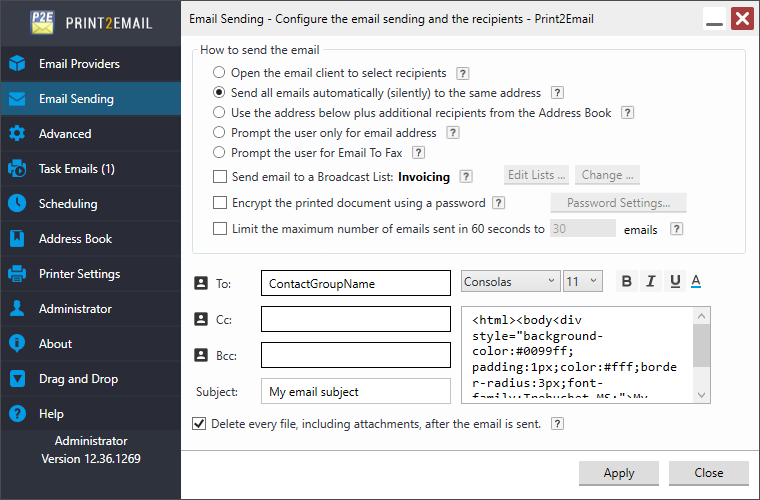 NOTE: Please note that the HTML email sending works with Outlook, Print2Email SMTP email sending, or predefined Gmail, Yahoo, AOL, iCloud, Hotmail or Exchange accounts in Print2Email.