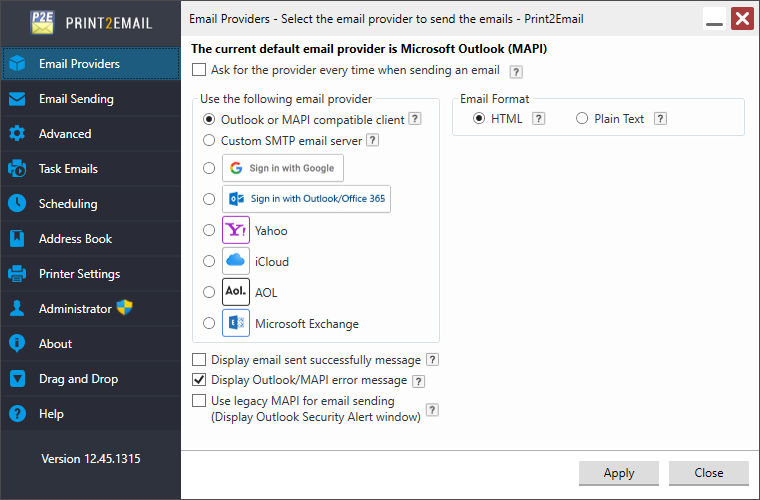 NOTE: Please note that the HTML email sending works with Outlook, Print2Email SMTP email sending, or predefined Gmail, Yahoo, AOL, iCloud, Outlook.com, or Exchange accounts in Print2Email.