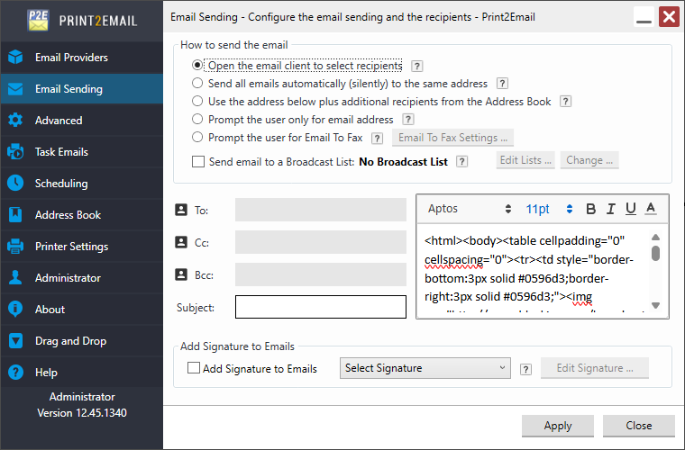 2. When printing a document to Print2Email, the predefined email body with the HTML code will be inserted to the email sending window automatically as HTML code.