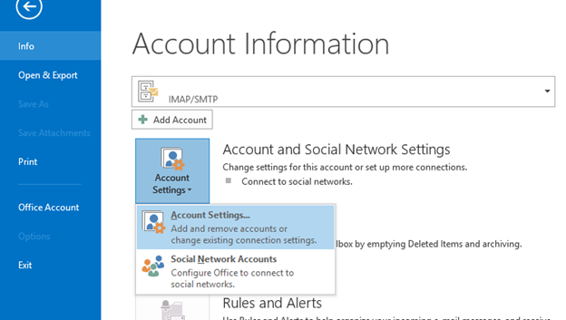 Under File tab, go to Info > Account Settings > Account Settings…