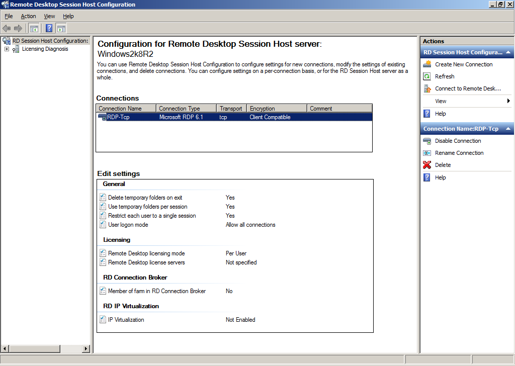 3. In the middle pane, under Connections, right click on RDP-Tcp and click Properties.