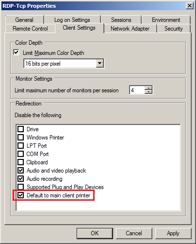 4. Click the Client Settings tab in the RDP-Tcp Properties dialog and make sure the checkbox for Default to main client printer is checked.