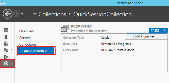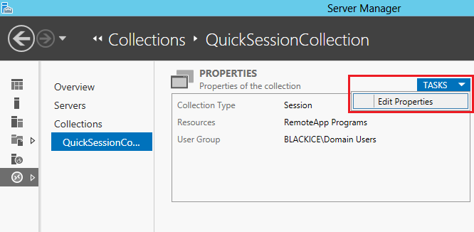 Open the Server Manager > and click on the Remote Desktop Services icon on the left menu and select the Session Collection you would like to configure.