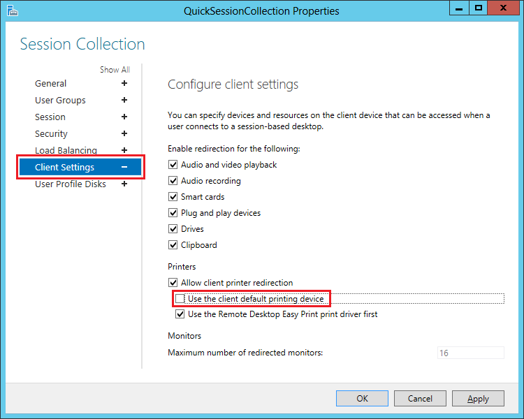 Once the Remote Desktop Service Role is deployed, the Default Printer can be set up.