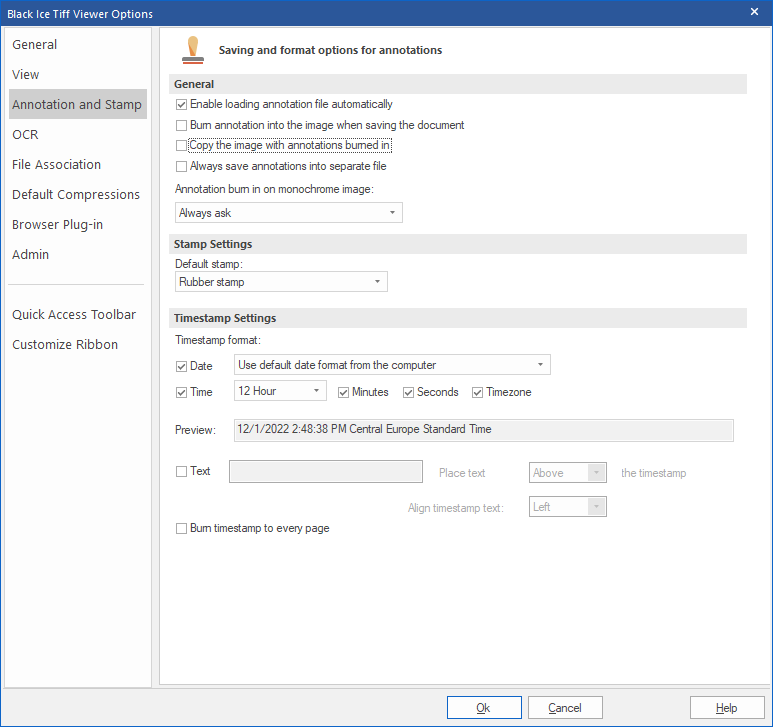 To configure the timestamp, go to the Home tab, More Options, and select the Annotation and Stamp option from the sidebar: